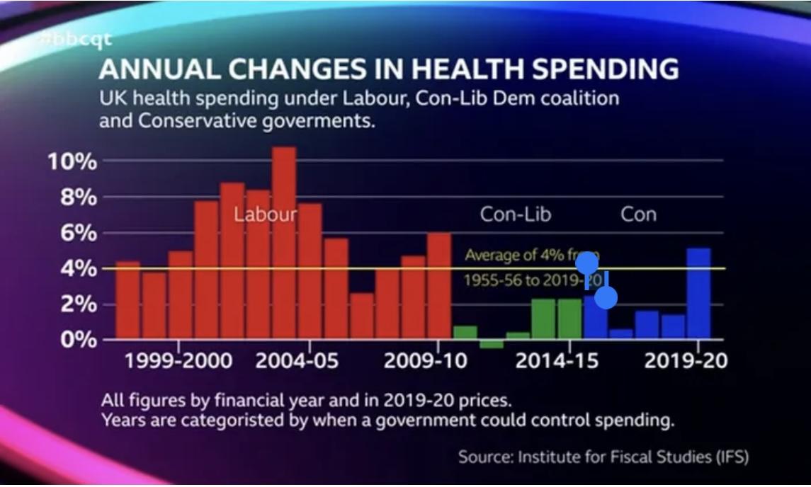 Below is a graph from the Institute of Fiscal studies used in last nights Question time. It shows why the NHS is in the mess it’s in. I would argue that no healthcare system, whether public or private financed could cope with that kind of deliberately diminished funding level.
