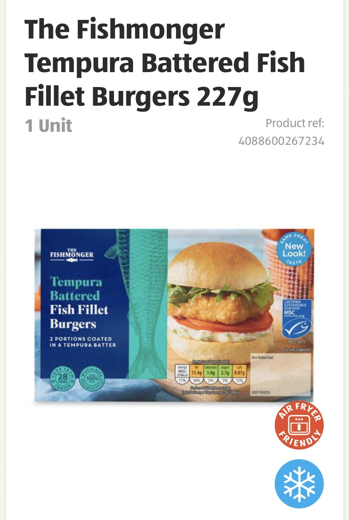 For fish lovers, also from Aldi. Tempura battered fish fillet burgers. Serve them in a bun with a slice of cheese and a spoon of tartar sauce, and you have a McDonald’s Fillet O Fish, they are made from Alaskan pollack, exactly the same as Mc D’s. Lovely, my nephews and nieces love them. They are about £2.30 for two.