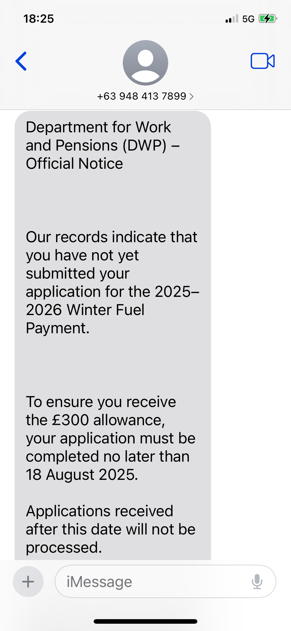 Reply To: Winter fuel allowance August 18, 2025 at 6:48 pm #311516 ajnParticipantI’ve had this text message obvious fake..