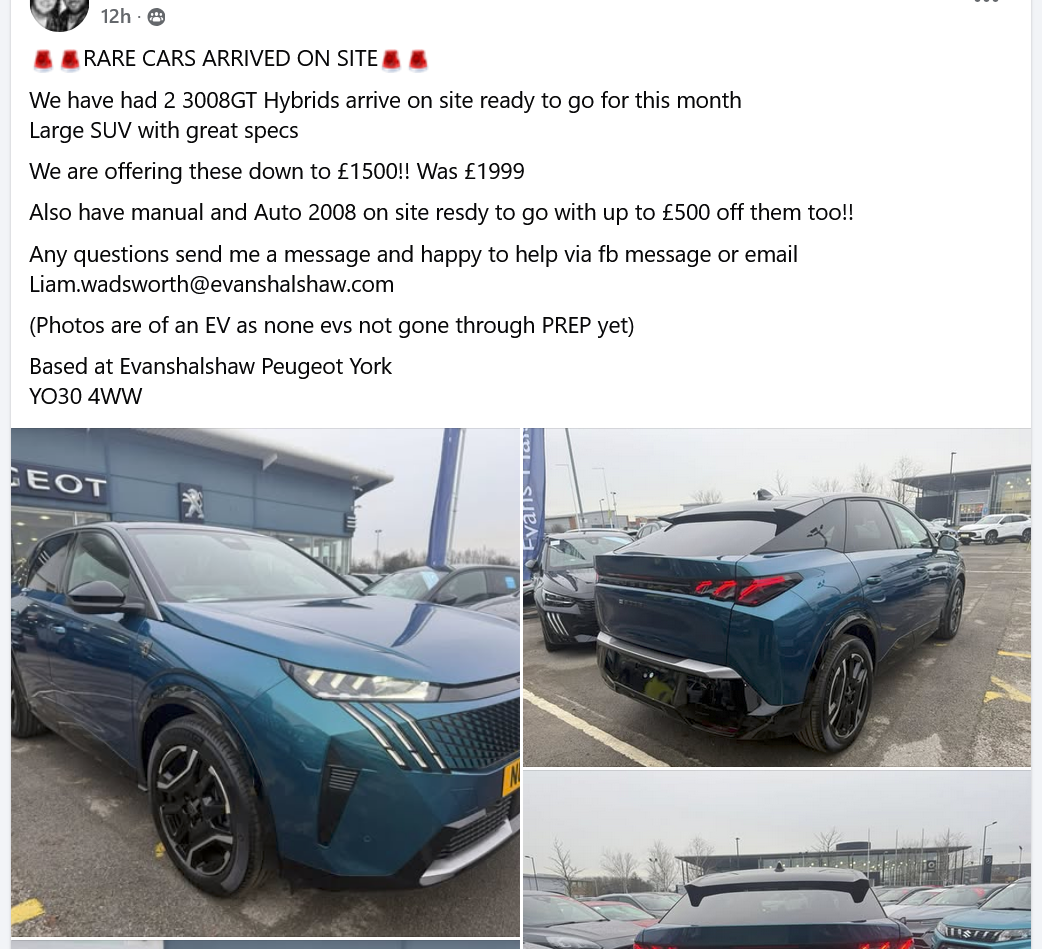 Via the usual fb groups posted yesterday 12th Jan 26, Evans Halshaw Peugeot in York are offering two stock Peugeot 3008 GT Hybrid Automatics with £499 off the AP. Also stock 2008 Auto and manuals with £500 off the AP. Dealership contact is Liam: