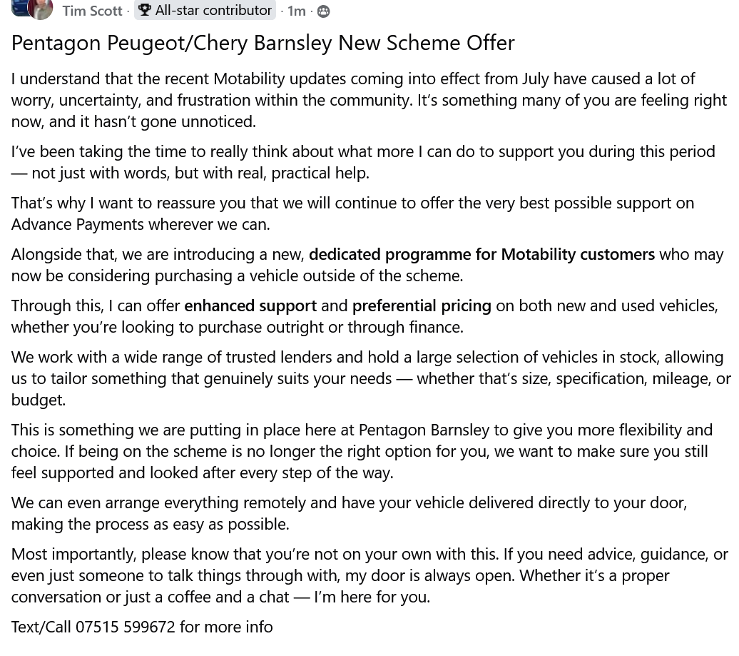 An interesting fb post, posted across the usual Motability related fb groups by a Motability dealership sales manager who frequently has special offers on Motability scheme vehicles. This was posted today 31st March 26. Obviously details of this scheme are not known as yet, but it does suggest dealers may be starting to be pro-active in trying to ‘Hoover up’ disenfranchised or disillusioned former Motability scheme customers by designing some sort of scheme for such. Hopefully more dealerships will do likewwise for this potentially untapped market: