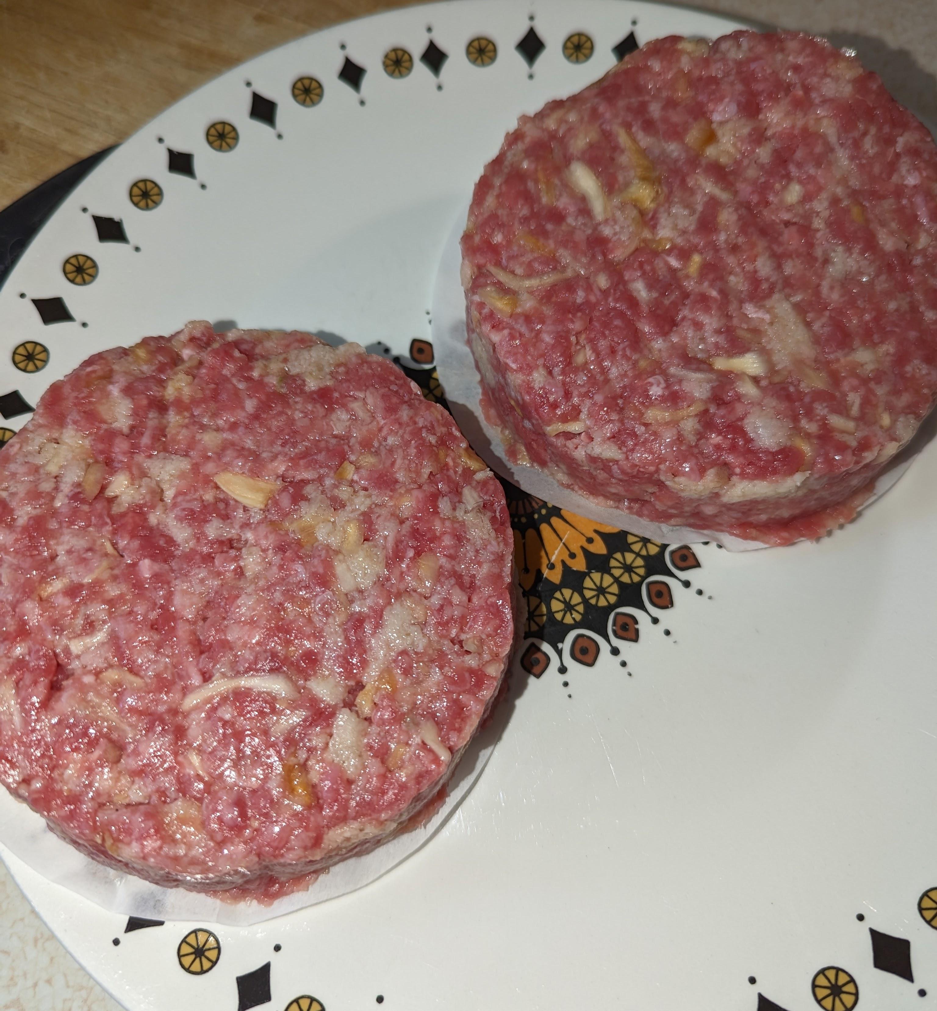 minced meat of choice, kibbled onion, which is dried onion i add a bit of water to to rehydrate. handy to have in stock..(although fresh would be better i guess) bread crumbs in this case stale bread which works best. seasoning of choice, and an egg added as a binder. stamps them out well. i added a bit of hendersons relish, chilli and garlic to mine..