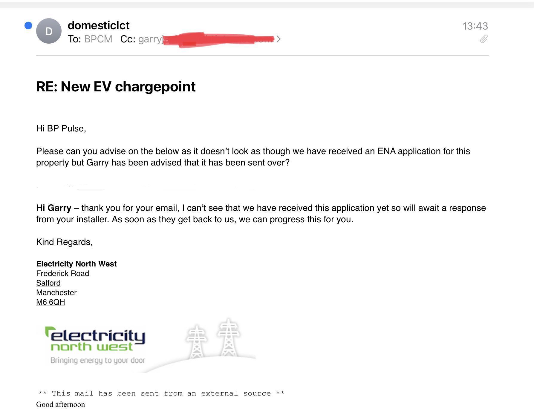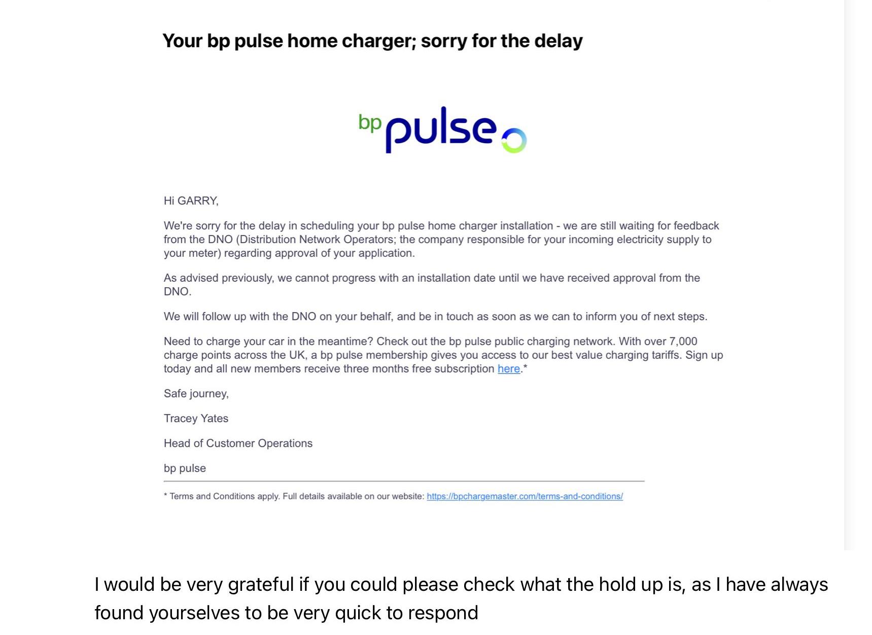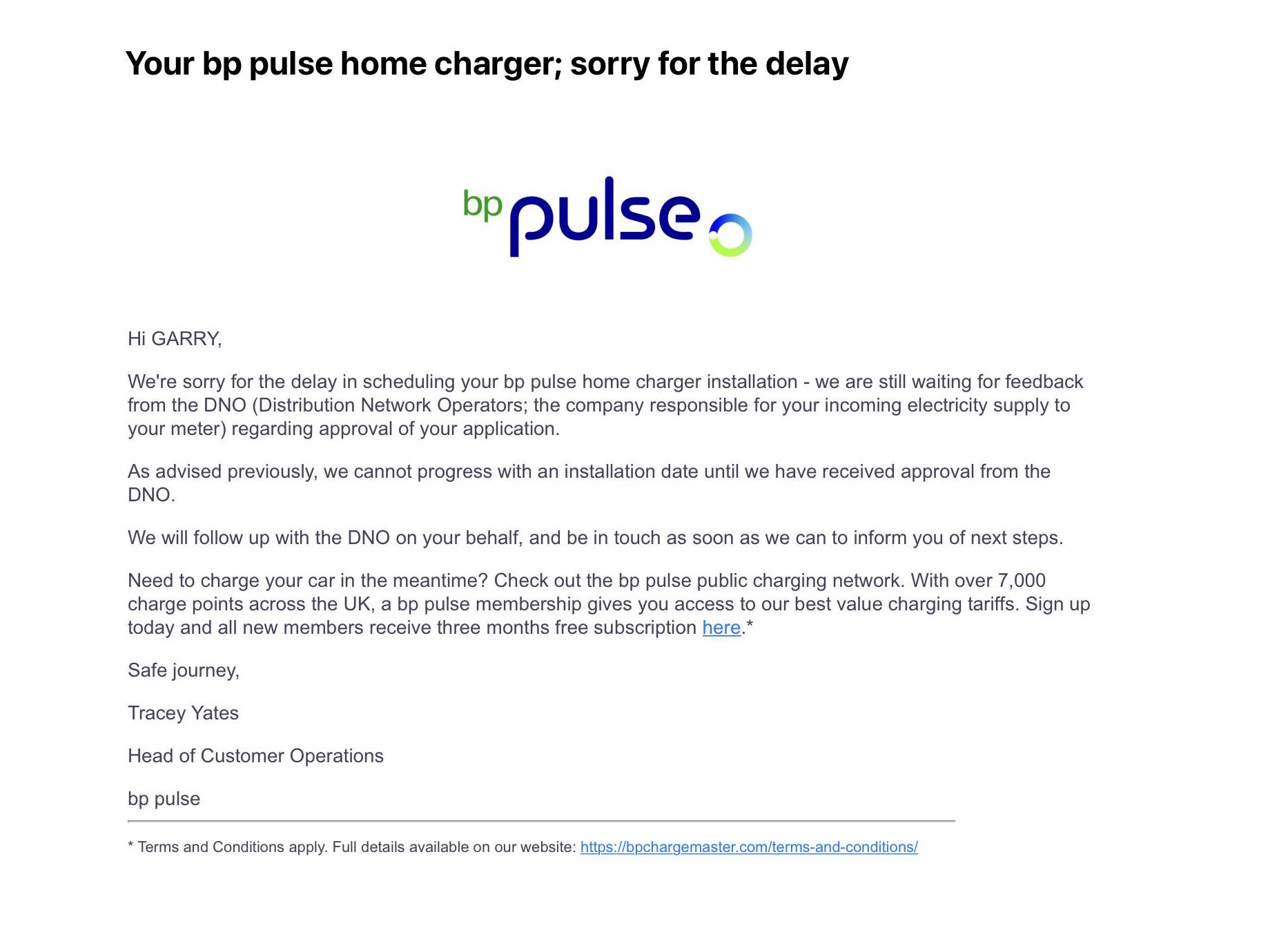 I have been in regular contact with my DNO for various other reasons and have found them very quick to respond to any queries. So when I received an email from bp pulse telling me it’s my DNO causing delay,