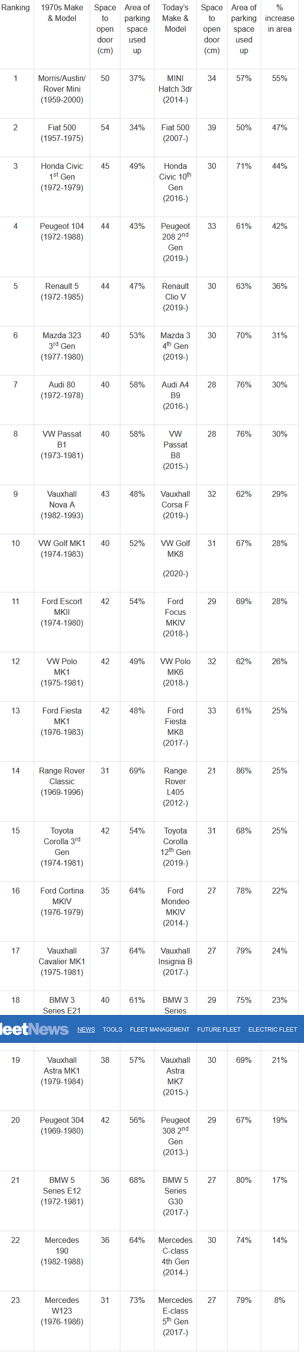 The Mini Hatch was the biggest grower on the list; 55% larger and taking up 20% more of the typical parking space than the original that was produced between 1959 and 2000. This means it offers 16cm less room for drivers to get out.