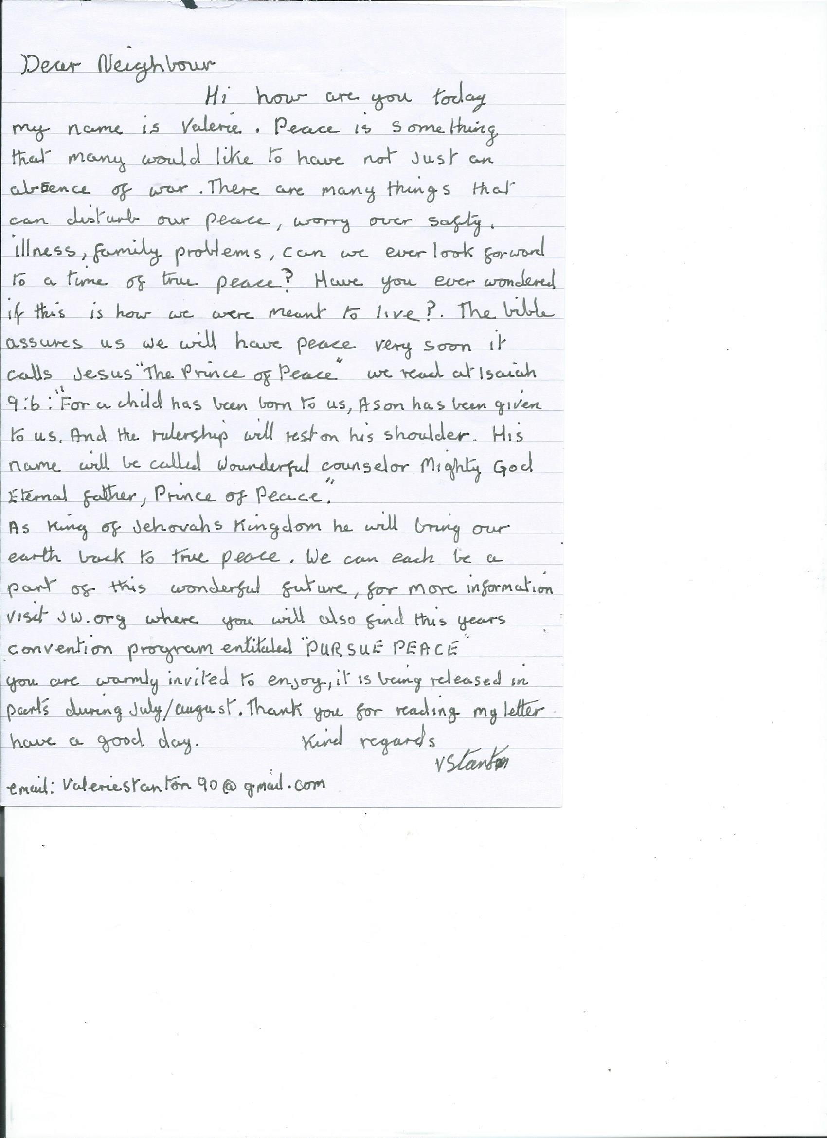 I (and several of my neighbours) got a very similar letter addressed to “The Occupant”this morning from a Valerie at my local (10 miles away) Kingdom Hall asking if I trusted in the Bible etc. etc.
