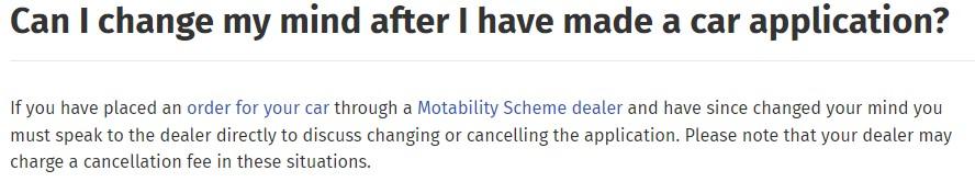 Motability has zero say in whether or not the dealership charges a cancellation fee.