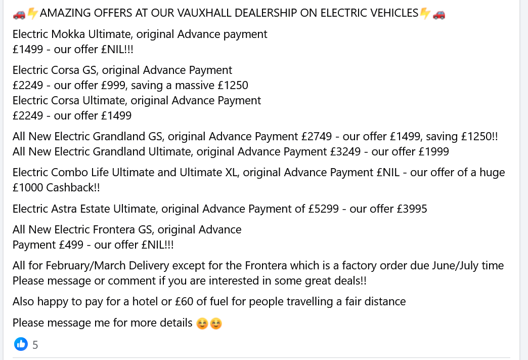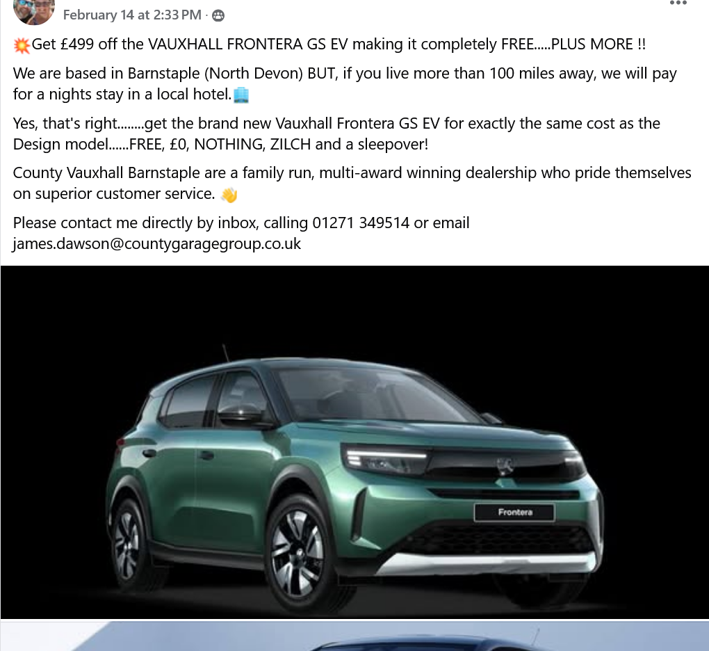 Via usual fb groups posted on 14th Feb 25, County Vauxhall in Barnstaple, Devon are offering the Vauxhall Frontera GS 83 kW, 44kWh at nil AP (normally £499). Dealersip will also pay for a night’s stay in a local hotel. No end date shown: