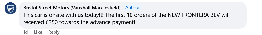 From the usual fb groups, posted yesterday 15th Feb 2025, Bristol Street Motors Vauxhall in Macclesfield are offering the first 10 Motability customers for the Vauxhall Frontera EV £250 towards the AP: