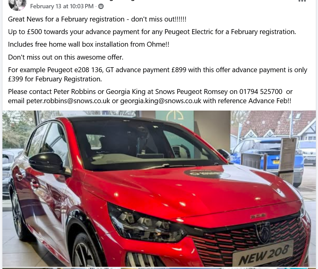 Via usual fb groups posted 13th Feb 2025, Snows Peugeot in Romsey, Hampshire are offering £500 towards the AP on any Peugeot EV for February 2025 registration (so stock/pipeline vehicles):