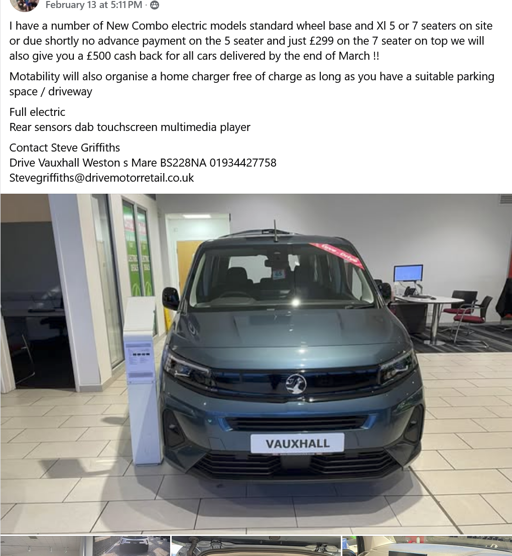 Via usual fb groups posted 13th Feb 25, Drive Vauxhall in Weston-Super-Mare are offering £500 cashback on all Vauxhall Combo electric models for delivery by the end of March 2025: