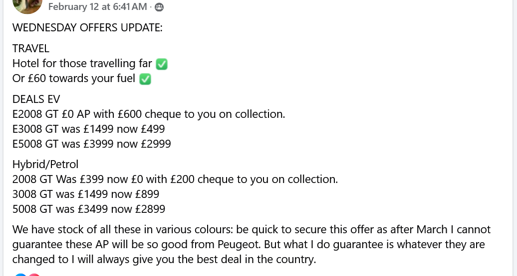 Via usual fb groups posted 12th Feb 2025, further to post #297042 (on page 2 of this thread), Pentagon Peugeot in Barnsley, South Yorkshire have revised thier offer, now including either on £200 or £600 cheque upon collection of the vehicle (details below)
