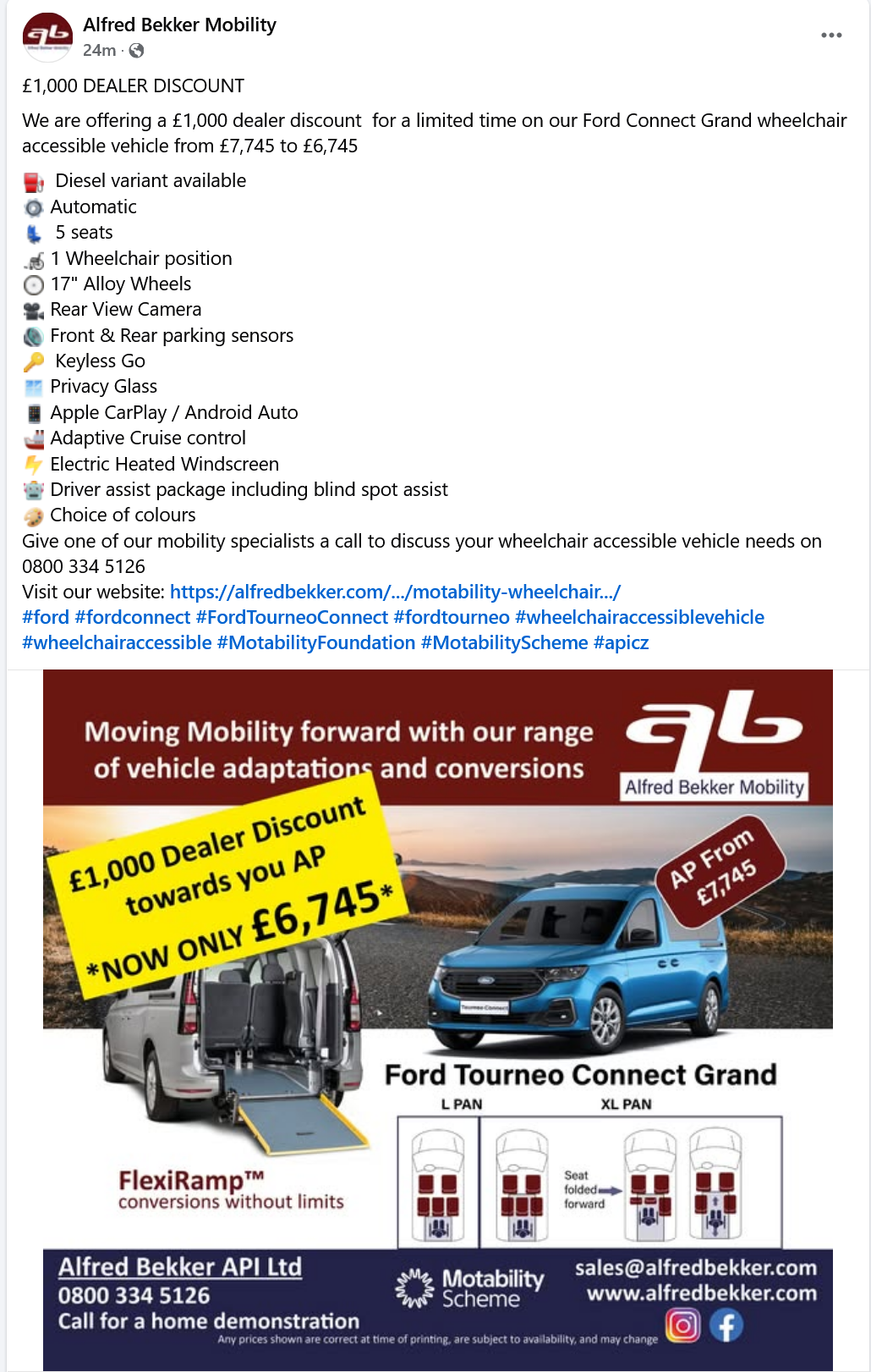 From the WAV converters fb page, posted today, 17 Feb 2025, a rare offer on a WAV. Alfred Bekker Mobility in Goole, East Yorkshire (the converters) are offering a £1000 dealer discount off the AP on the WAV Ford Connect grand automatic ‘for a limited period’: