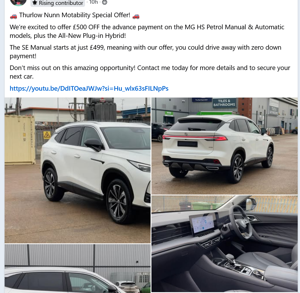As stated in my original post, the offer came via the fb Motability related groups. If you wiish to access the original ad, you will need to apply to the individual fb groups (there are about 5 main ones) and be admitted by the respective group’s admin to access them. The offer you are referring to is actually posted on two or three of the main related groups (you will need to scroll through the posts). Sorry if this maybe a little cryptic, however reposting ads from the groups is strictly against the t&c’s of the groups. A few members hereabouts were banned from the groups for reposting ads. Hence I walk a pretty fine tightrope (with a few diversions) to get the ads reposted here and maintain group access. Dave