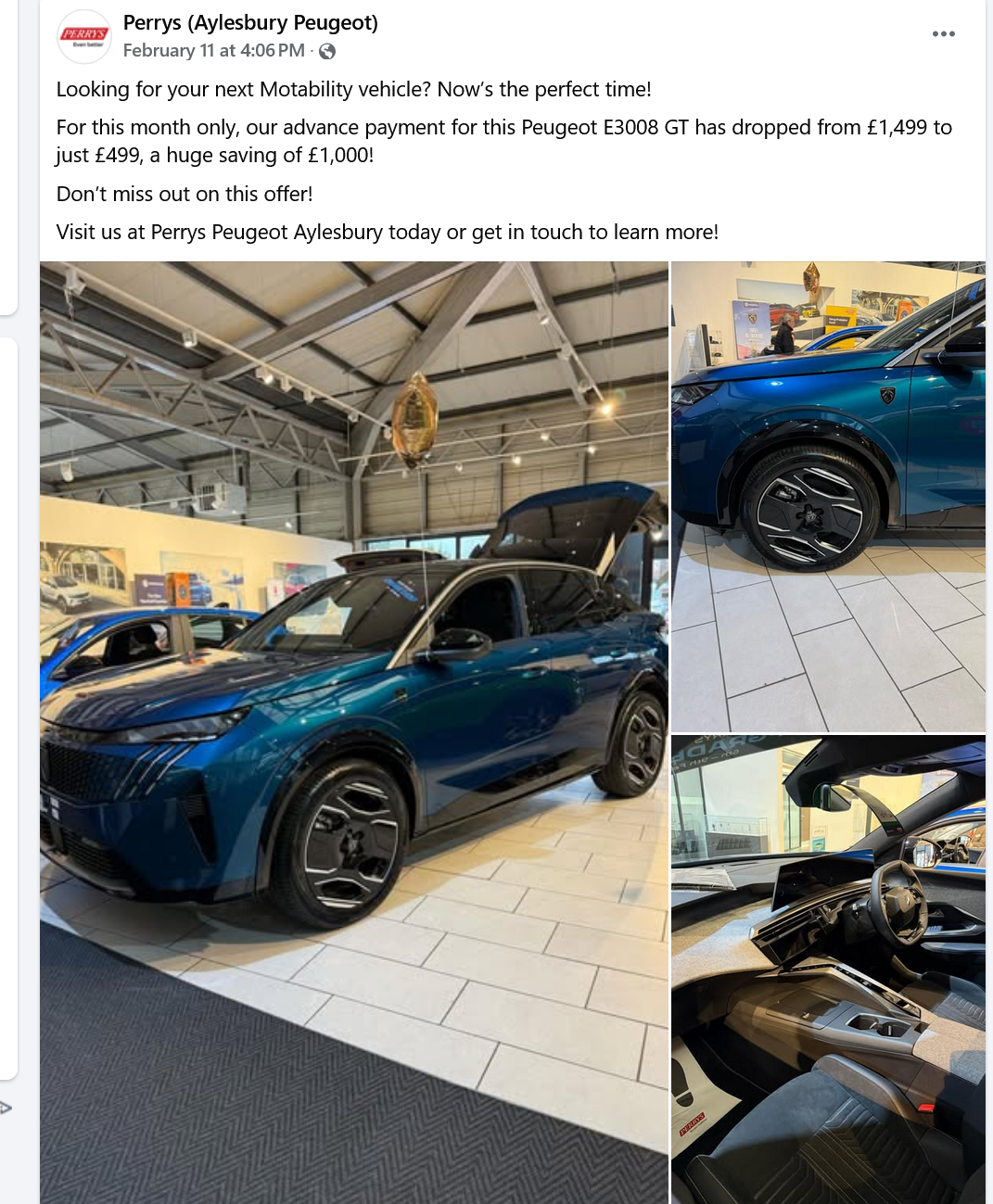 Reposted yesterday (17/02/25) on usual fb groups from original post on dealership fb page, Perrys Peugeot in Aylesbury are offering £1000 off the AP of the Peugeot E-3008 GT. February 2025 orders only.