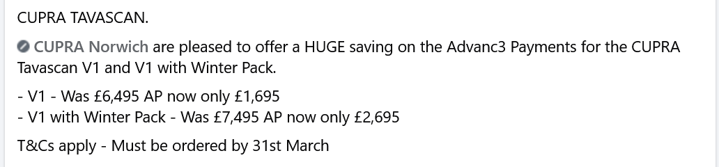 Another Cupra dealership offering big money off the Tavascan AP. From the dealership’s website, Mon Motors Cupra in Bristol and Gloucester are offering £4800 off both the Cupra Tavascan V1 and Tavascan V1 with winter pack. For orders placed by 31st March 2025: