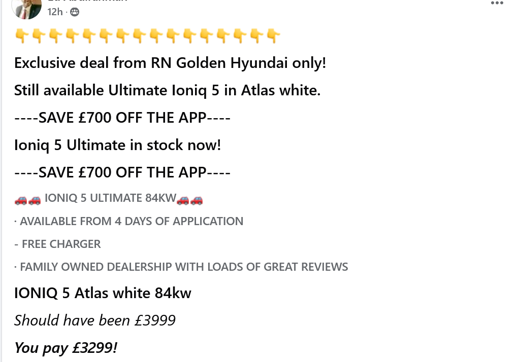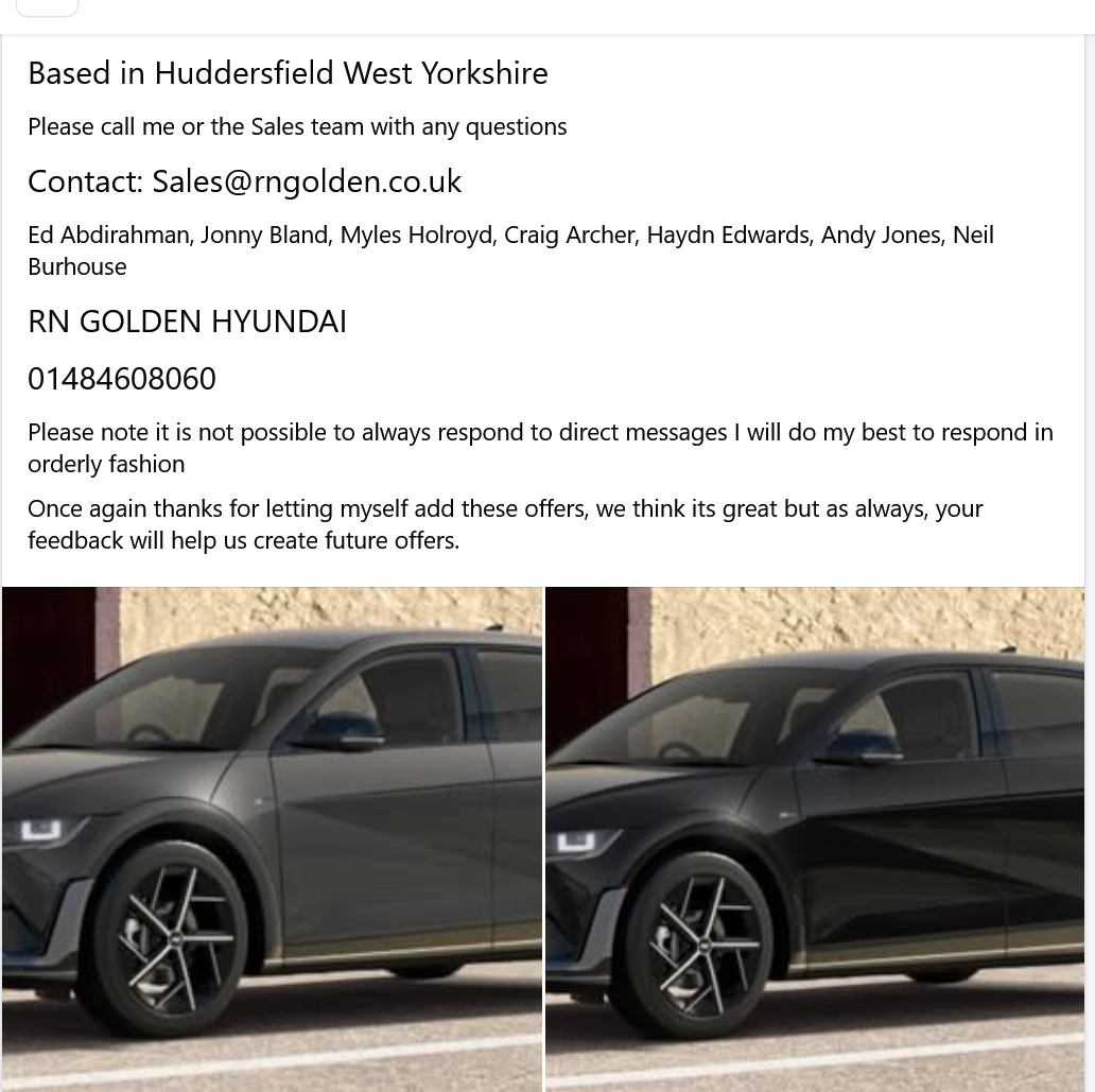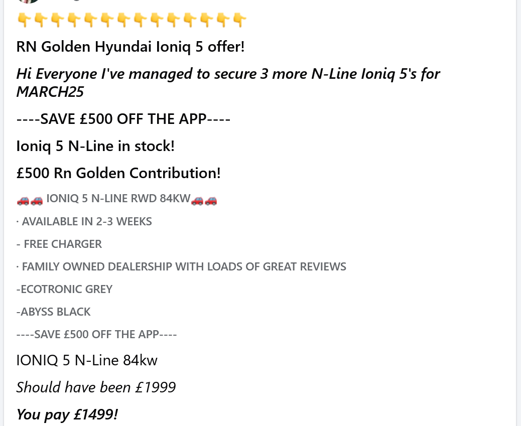 Via usual fb groups, posted yesterday 18 Feb 25, RN Golden Hyundai in Huddersfield, West Yorkshire are offering £500 off a limited number of pipeline Hyundai Ioniq 5 models for Match 2025 delivery: