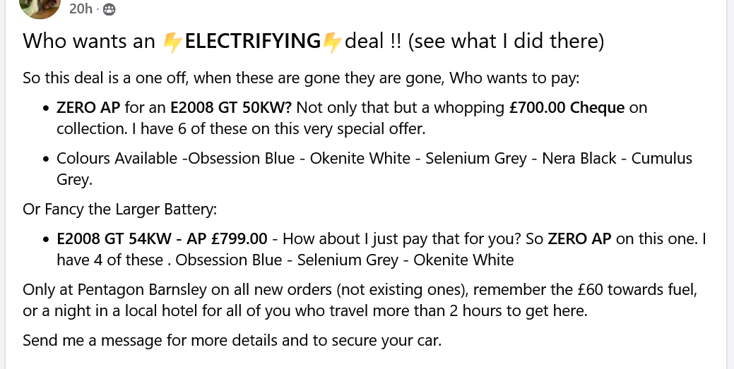 Via usual fb groups posted yesterday (18/02/25), Pentagon Peugeot in Barnsley have revised their previous offer (posted at #297760 above) on the Peugeot E-2008 GT. Details below: