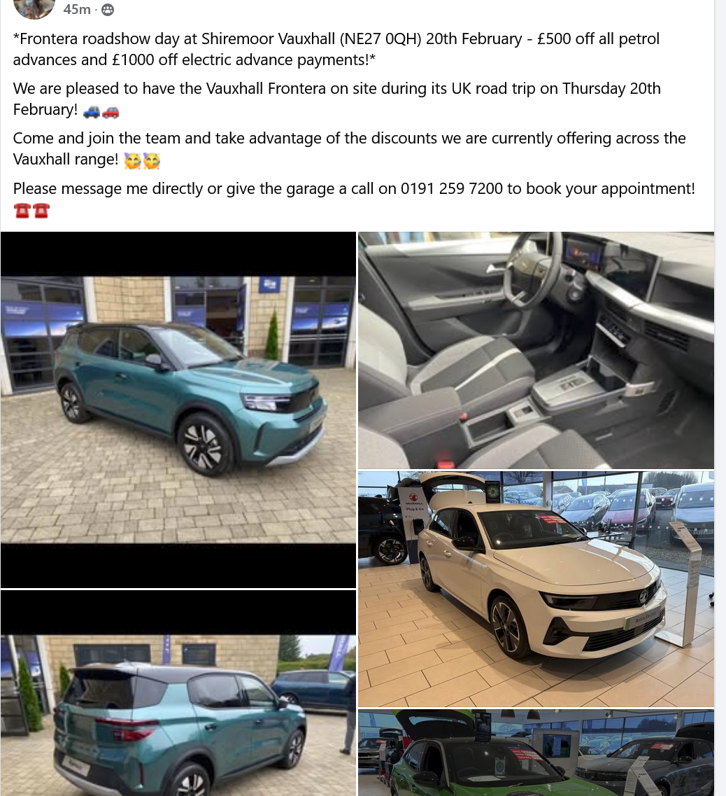 Via usual fb groups, posted today 19th Feb 2025, Evans Halshaw Vauxhall in Shiremoor, Tyne & Wear are hosting a Vauxhall Frontera Roadshow day on Thursday 20th Feb 2025 and are offering £500 off petrol models and £1000 off EV models (may possibly be cashback if models under relevant AP’s?). Dealership contact is Jack: