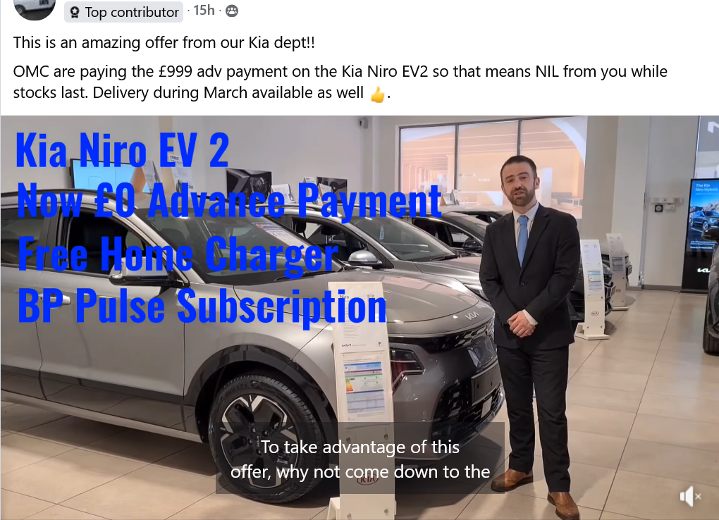 Via usual fb groups posted yesterday 8th March 25, x ref post #298554 same offer in Feb 25, OMC Kia in Oldham Greater Manchester are again offering the Kia Niro EV2 with a £999 AP contribution (making it nil AP). Whilst stocks last presumably.