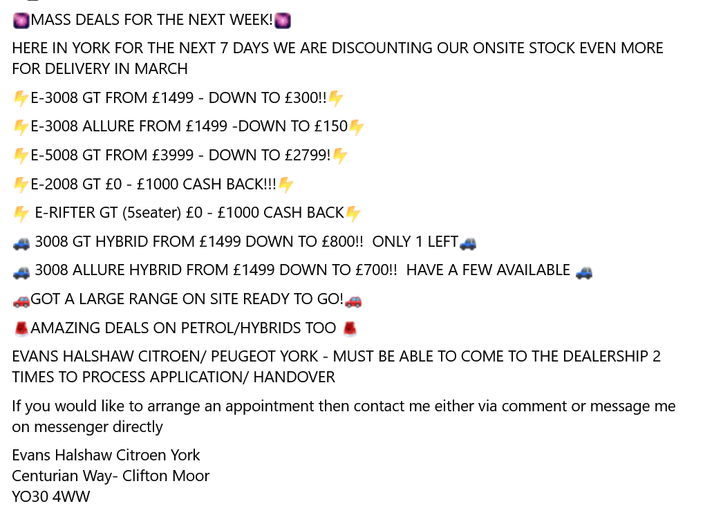 Via the usual fb groups posted today 8th March 25, Peugeot wars in Yorkshire continues! This time (and further to the previous offer from this dealership at post #298803), Evans Halshaw Peugeot/Citroen in York have again reduced AP’s further on certain models for the next 7 days. For March 2025 delivery. Dealership contact is Liam.