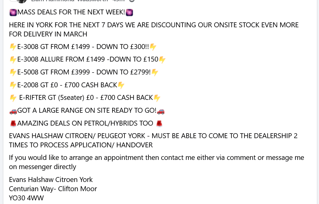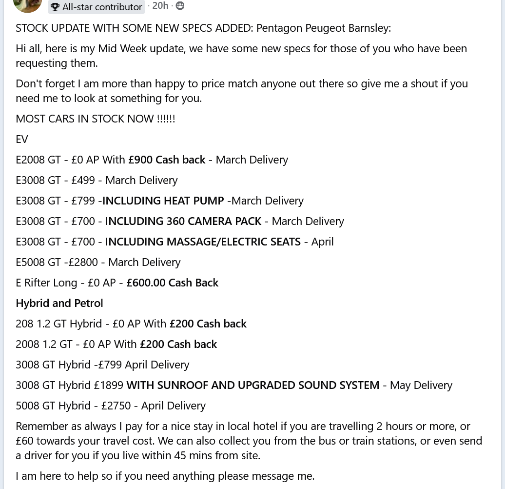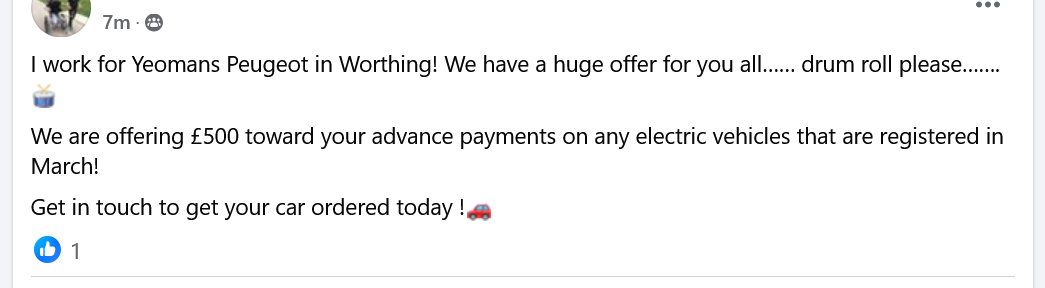 Via usual fb groups posted today Monday 10th May 25, Yeomans Peugeot in Worthing, West Sussex are offering £500 towards the AP on any electric vehicle registered in March 2025. Dealership contact is Maisie.
