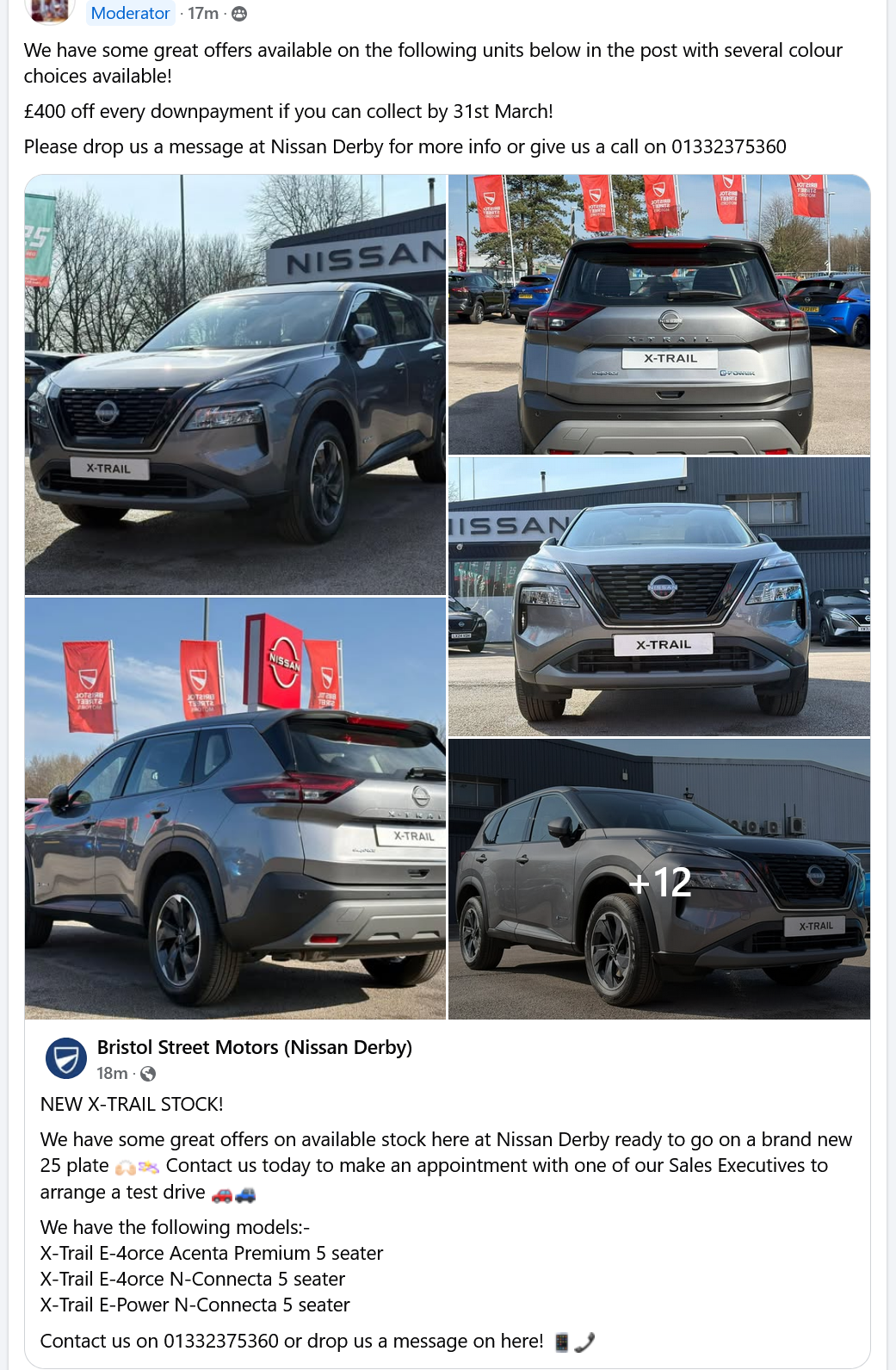 Via the usual Motability related fb groups, posted today 8th March 2025, Bristol Street Motors Nissan in Derby are offering a £400 AP reduction on various models/trims of the Nissan X-Trail as listed below. For collection by 31st March 2025 (so stock or possibly short pipeline):