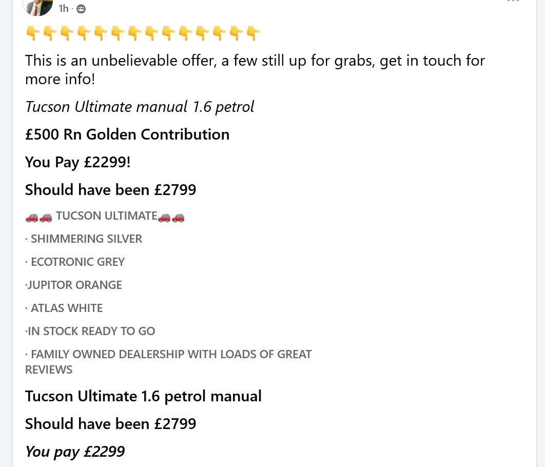 Via the usual fb groups posted today 8th March 25, RN Golden Hyundai in Huddersfield, West Yorkshire are offering a £500 dealership AP contribution off stock Hyundai Tucson Ultimate 1.6 petrol manuals. Whilst stock lasts presumably.