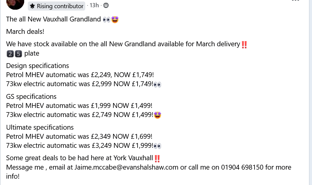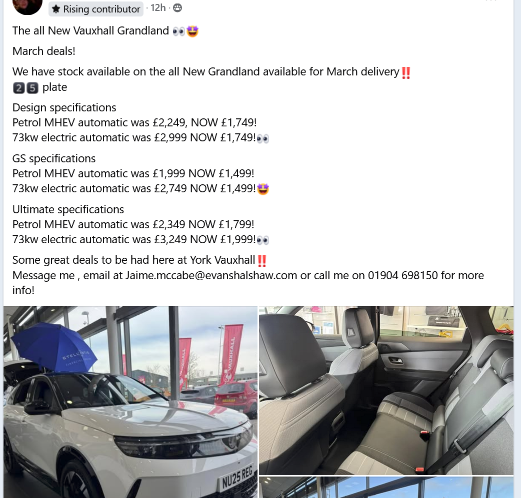 Via usual fb groups, posted yesterday evening 8th March 25, Evans Halshaw Vauxhall in York have reduced the Advance Payment for stock Vauxhall Grandlands (both petrol-mild hybrid and electric) in various trim levels as listed below. For delivery in March 2025. Whilst stocks last presumably.