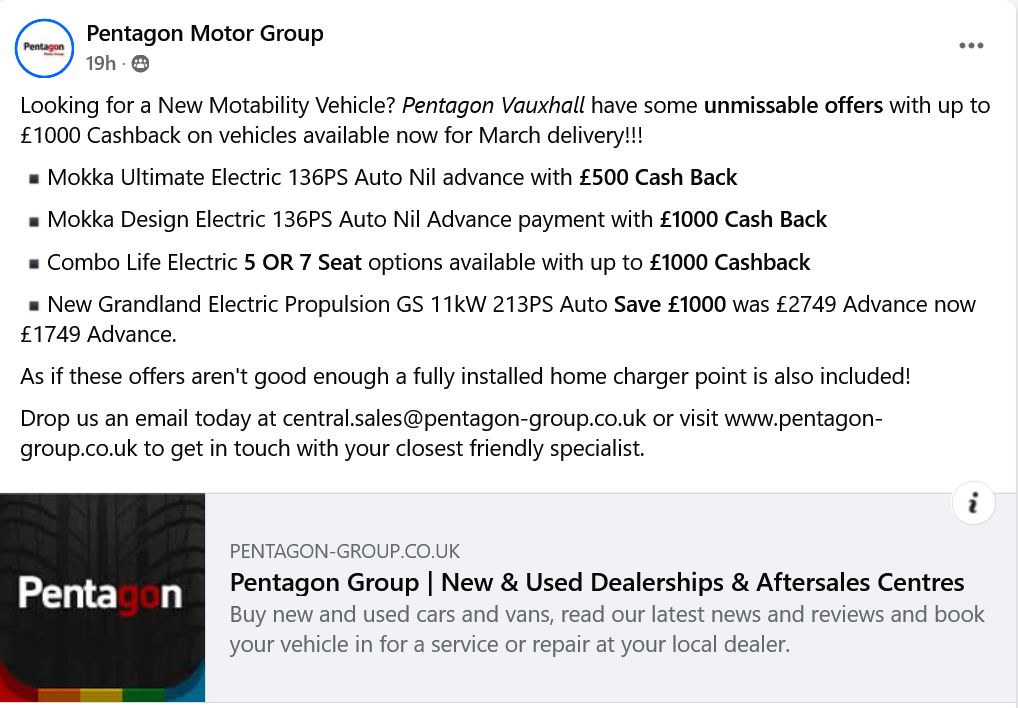 From the dealer group’s fb page posted yesterday (11th March 2025), Pentagon Vauxhall (Vauxhall branches in Burton on Trent, Deeside, Derby, Glasgow, Lincoln, Loughborough, Mansfield, Middleton Gtr Manchester, Nottingham, Oldham and Sheffield) are offering upto £1000 cashback/discount on the following Vauxhall EV’s for March 2025 delivery:
