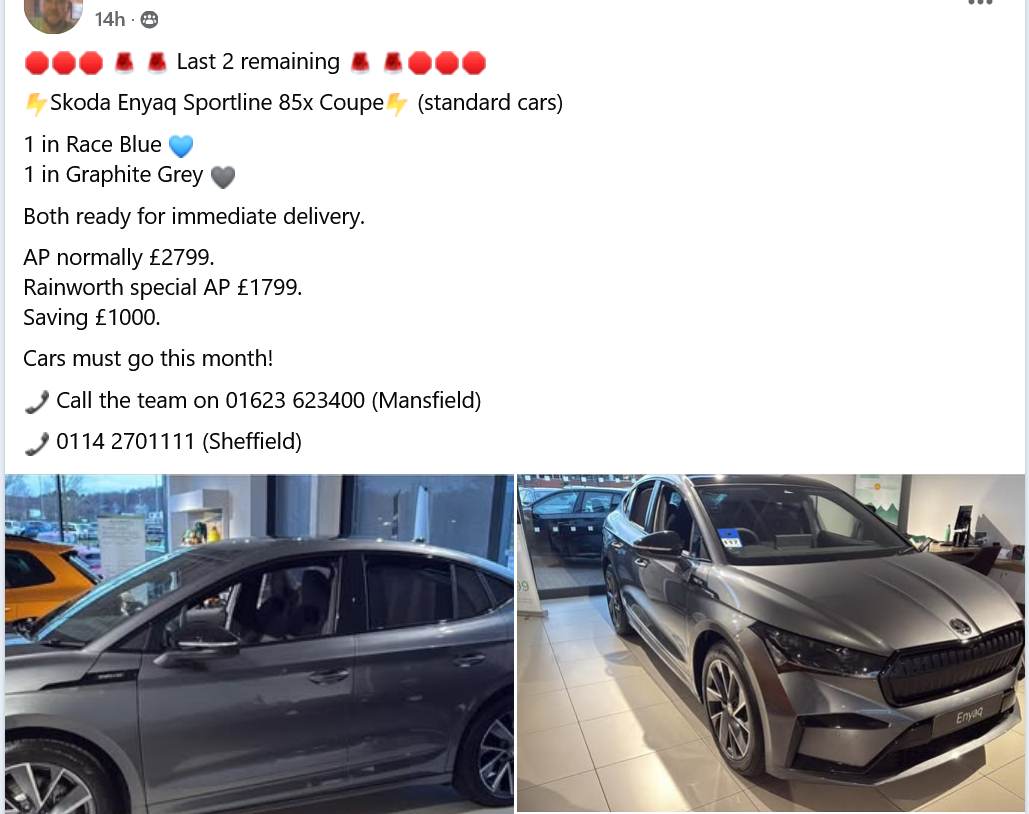 Via usual fb groups, posted yesterday evening (11 March 25), Rainworth Skoda in Mansfield & Sheffield are offering £1000 off AP on their last two Skoda Enyaq Sportline 85x Coupes. For March 2025 delivery whilst stock lasts.