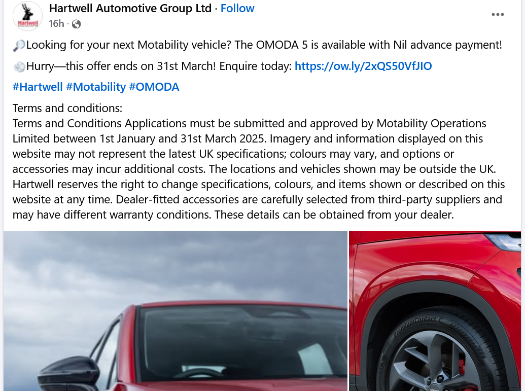 From the dealership’s fb page posted yesterday 11th March 2025, Hartwell Automotive Group Omoda in Abingdon, Hereford and Grimsby are offering the Omoda 5 Comfort for Nil AP (normally £1499) on orders placed and accepted by Motability by 31st March 2025. Also offering the Nobel trim level for £749 (£1250 off):