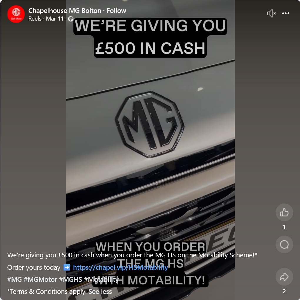 From the dealership’s fb page posted on 11th March 2025, Chapelhouse MG in Bolton Greater Manchester are offering £500 cashback on the MG HS. For orders placed by 31st March 2025: