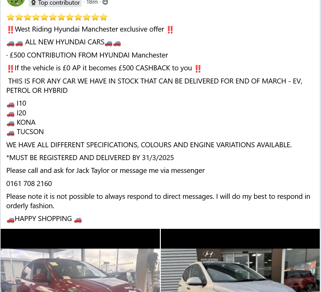 Via usual fb groups posted today 12 March 25, West Riding Hyundai in Salford Manchester are offering a £500 dealership AP contribution (or cashback) on stock Hyundai i10. i20, Kona and Tucson’s for delivery before end of March 2025: