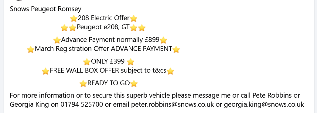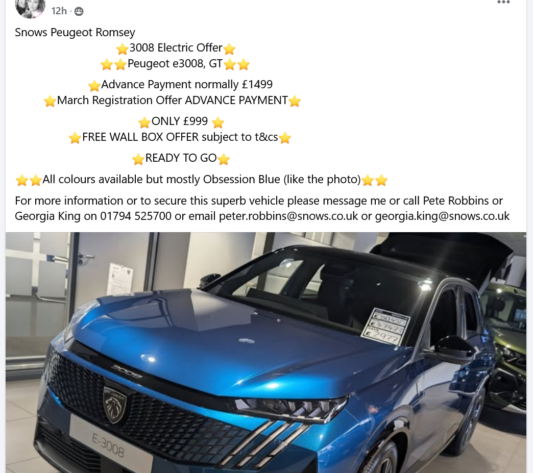 Via usual fb groups, posted yesterday afternoon 12 March 25, Snows Peugeot in Romsey Hampshire are offering £500 off the AP of the Peugeot 3008 GT electric and Peugeot 208 GT electric for March 2025 delivery.