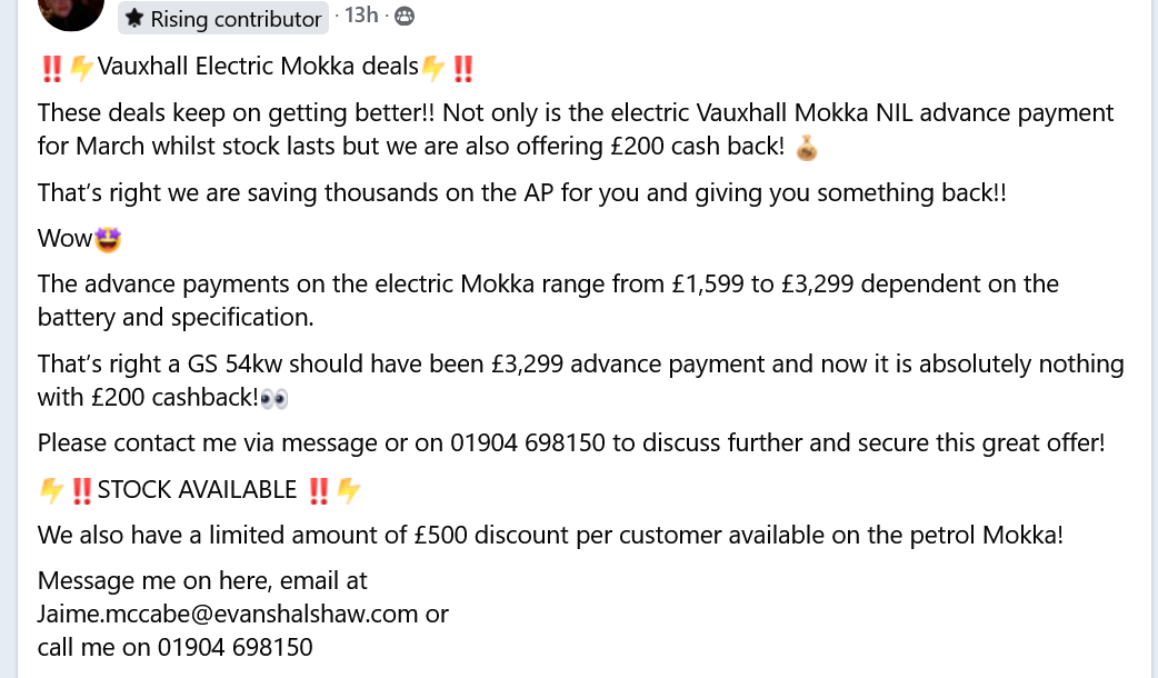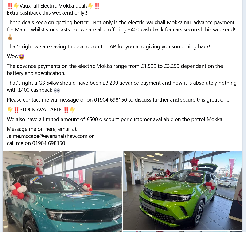 Further to posts upthread re NIL AP offers on the Vauxhall Mokka Electric, as posted yesterday (12 March 25) on the usual fb groups, Evans Halshaw Vauxhall in York are now going further and as well as Nil AP are offering £200 cashback as well for March 2025 delivery:
