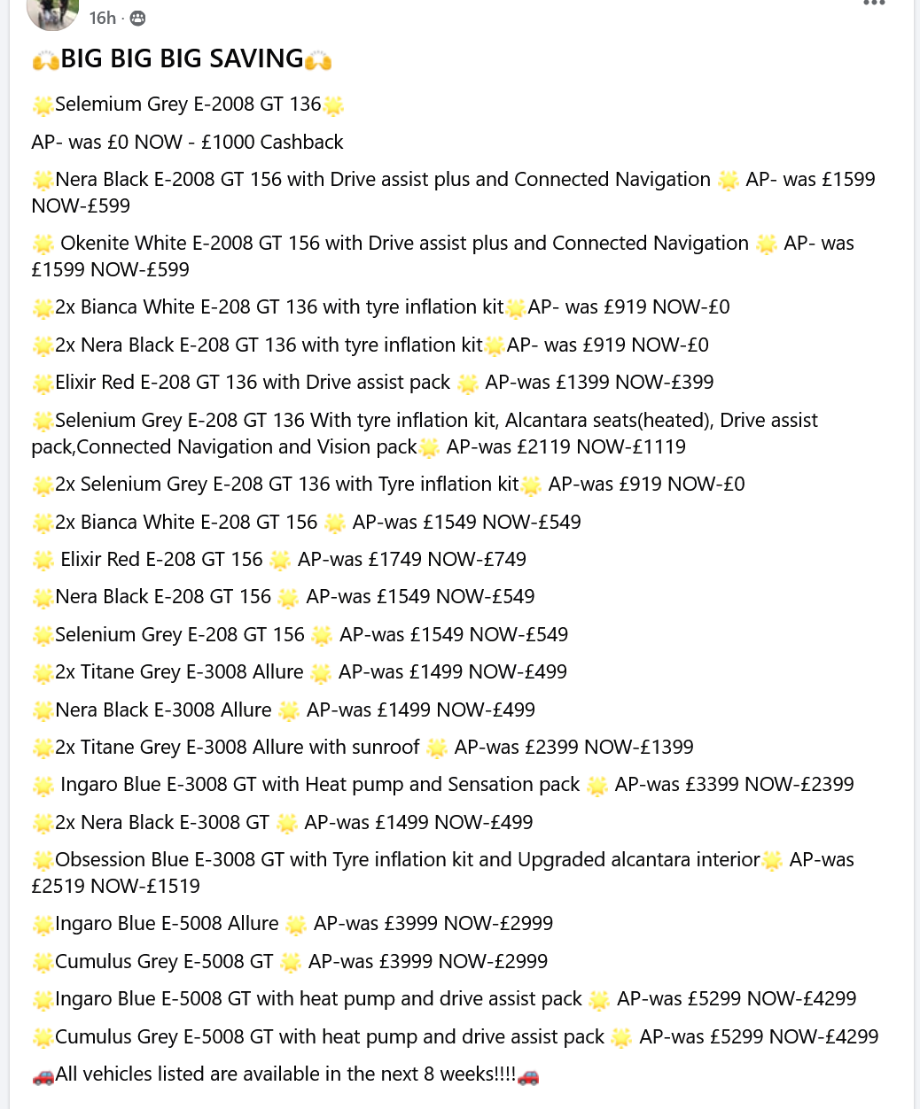 Via the usual fb groups, posted yesterday 12 March 25, Yeomans Peugeot in Worthing, West Sussex are offering the following Peugeot discounts of upto £1000 off the AP (some are limited numbers): Dealership contact is Maisie: