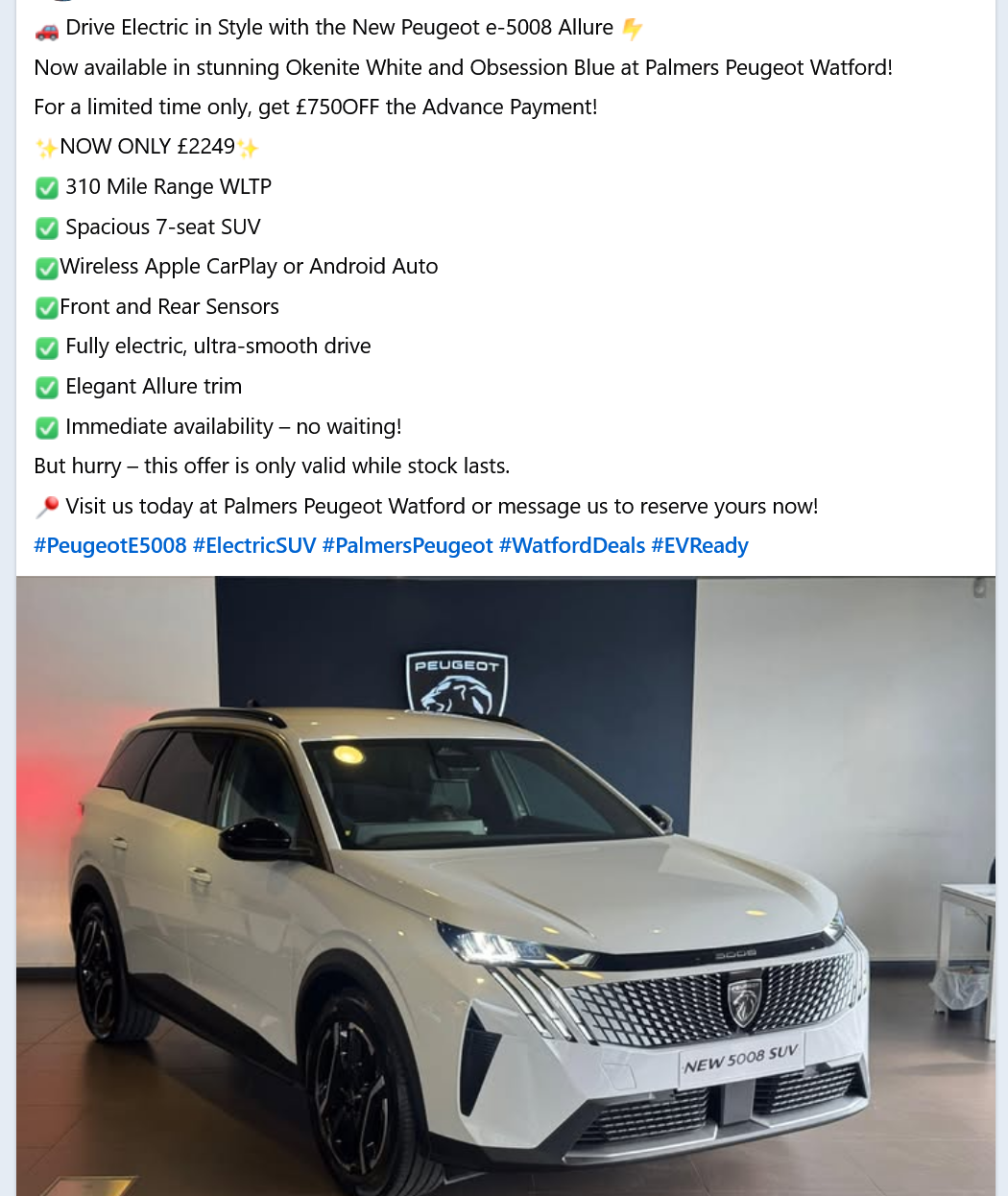 x ref previous £500 off offer posted at #307100. Via the usual fb groups posted yesterday night 27 June 25, Palmers Peugeot in Watford have now increased the dealership discoun t to £750 off the Peugeot e-5008 Allure. Whilst stocks last.