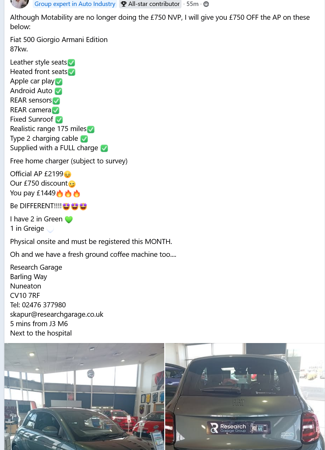 Via the usual fb gfroups, posted this morning 14th April 25, Research Garage Fiat in Nuneaton Warwickshire are offering £750 off the AP of two stock Fiat 500 Giorgio Armani Edition EV’s. Dealership contact is Sanjay.