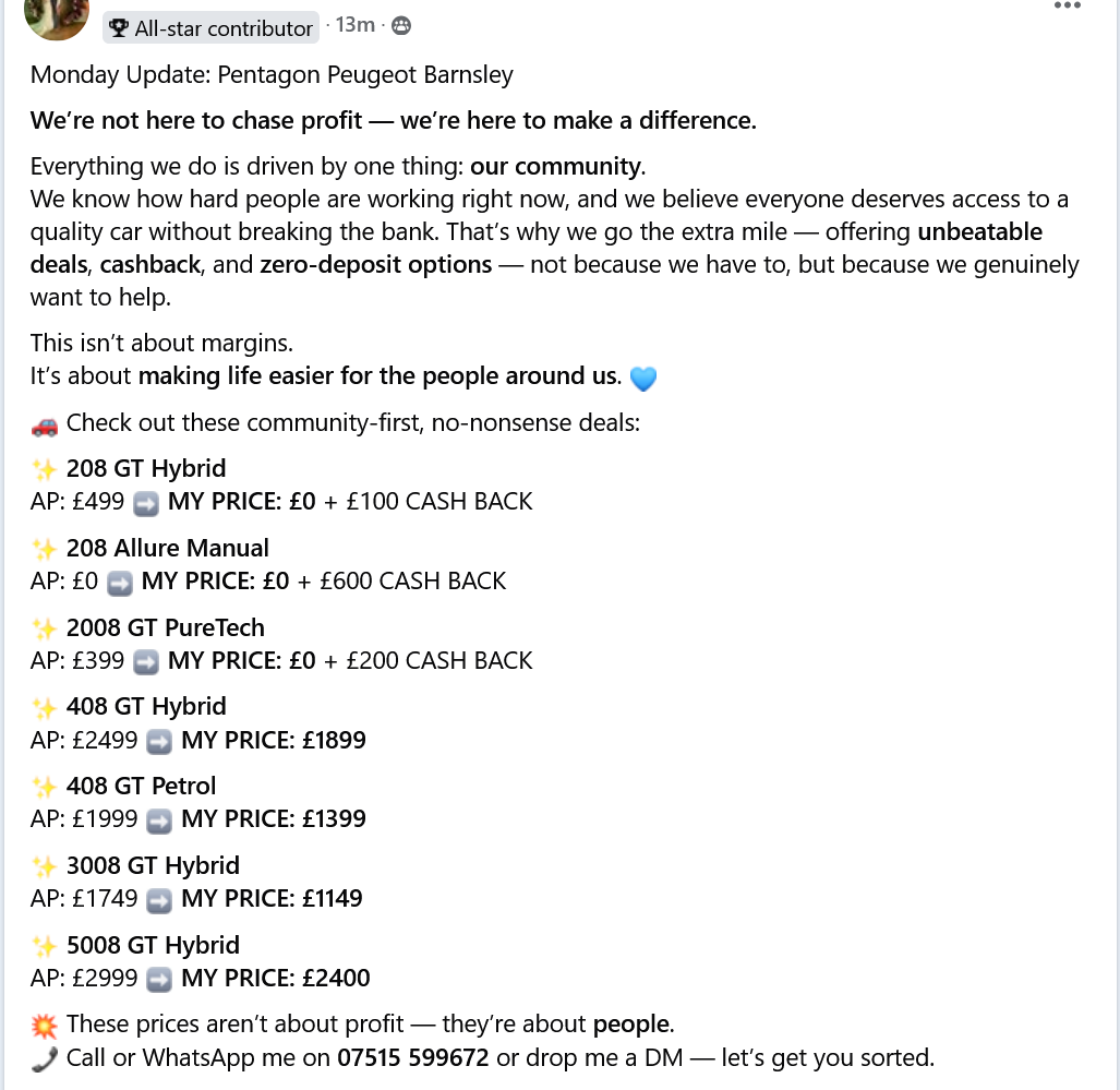Via the usual fb groups posted this mirning, 14th April 25, Pentagon Peugeot in Barnsley, South Yorskghire have slightly amended their previously posted AP discount and cashback deals as follows. Dealership contact is Tim.