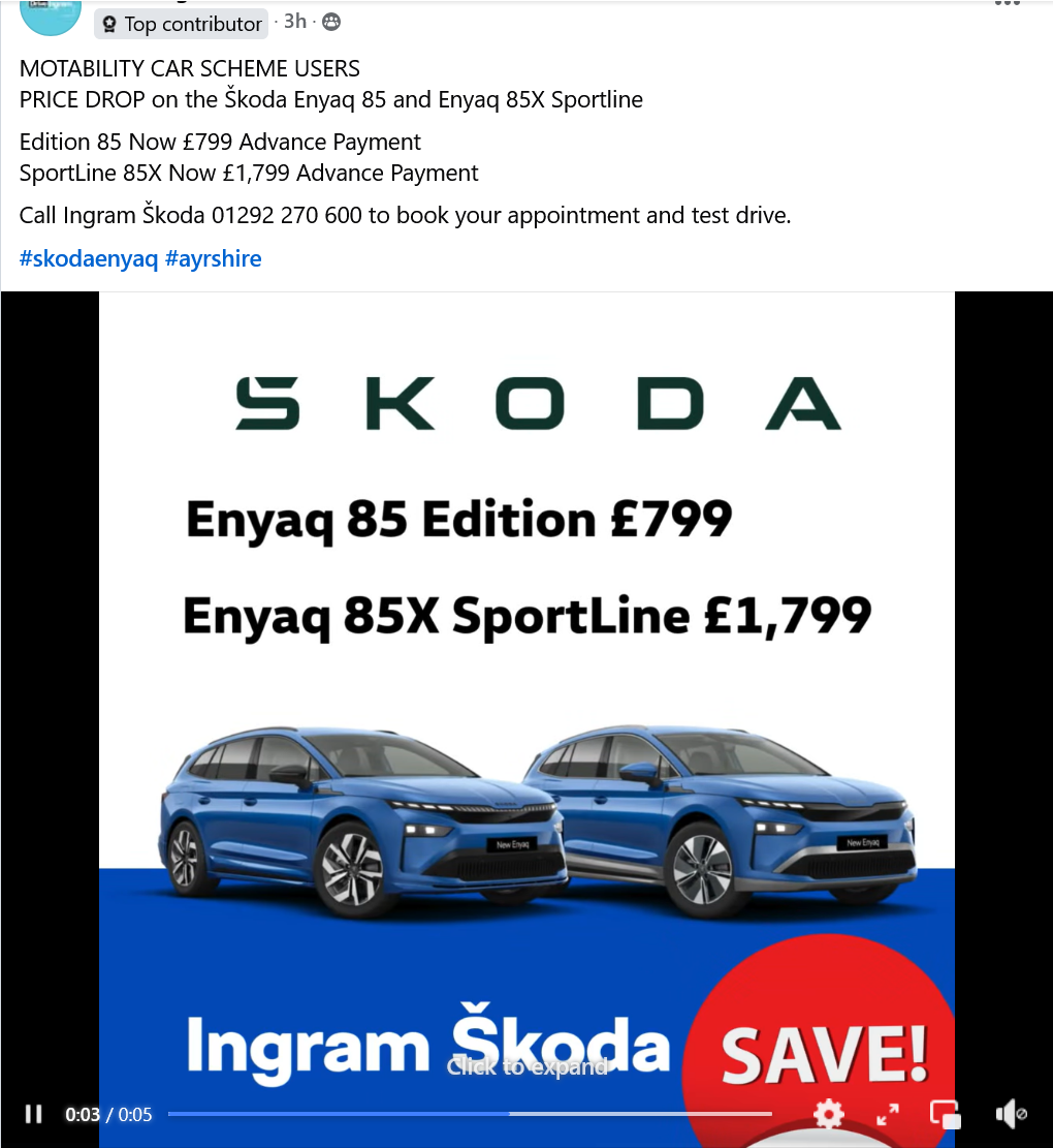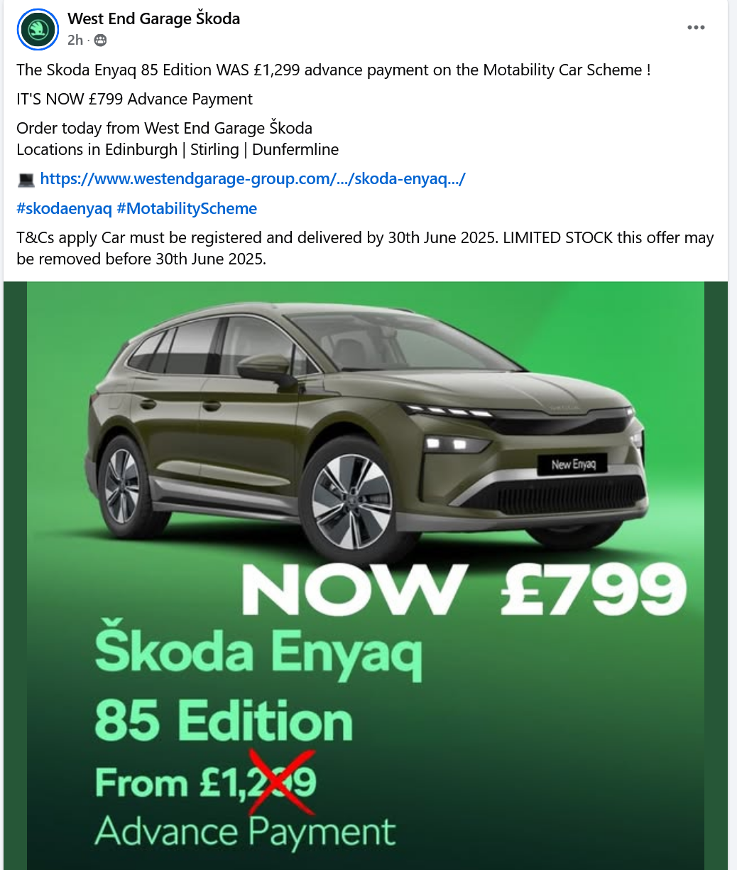 Via the usual fb groups posted today 14th April 25, Ingram Skoda in Ayr, Scotland are offering the Skoda Enyaq 85 Edition for £799 (normally £1299) and the Enyaq 85X Sportline for £1799 (normally £2299). Valid for applications to Motability from 1st of April to the 30th of June 2025.