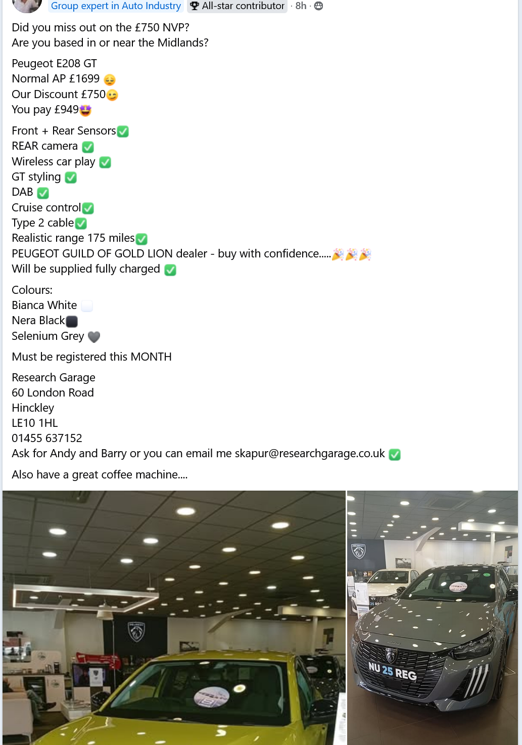 Via the usual fb groups posted today 14th April 25, Research Garage Peugeot in Hinckley are offering £750 off stock Peugeot E208 GT in a choice of 3 colours, For April 2025 delivery.