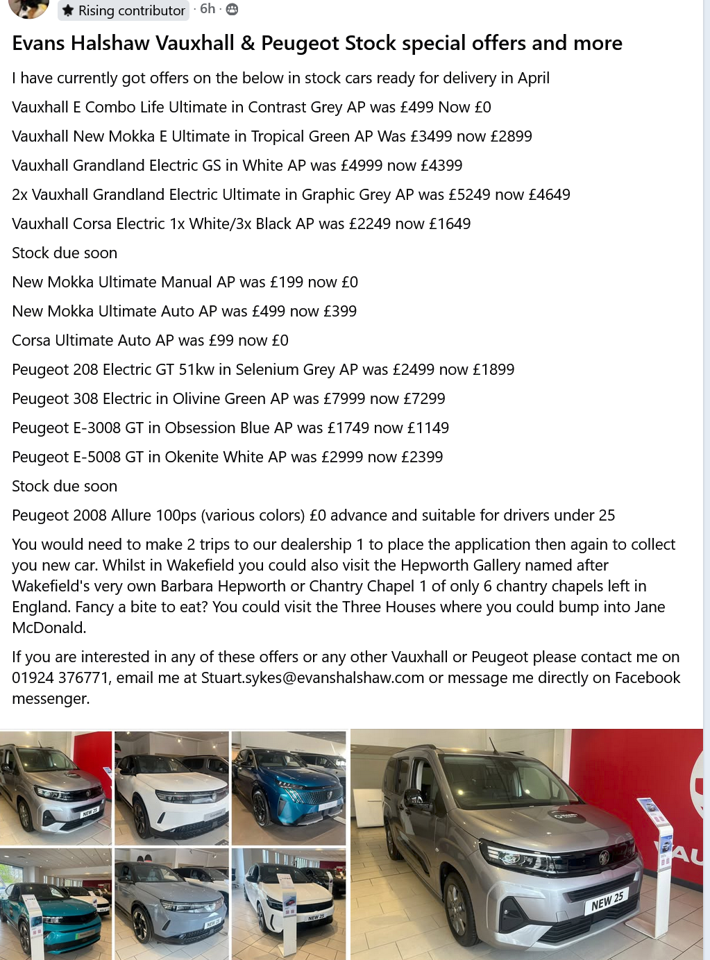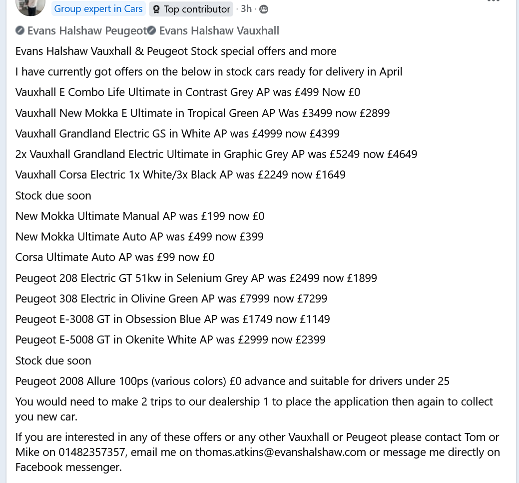 Via ther usual fb groups posted today 14th April 25, Evans Halshaw Vauxhall & Peugeot in Wakefield West Yorkshire are offering various discounts on stock/pipeline Vauxhall & Peugeot models as detailed below. For April 25 delivery.