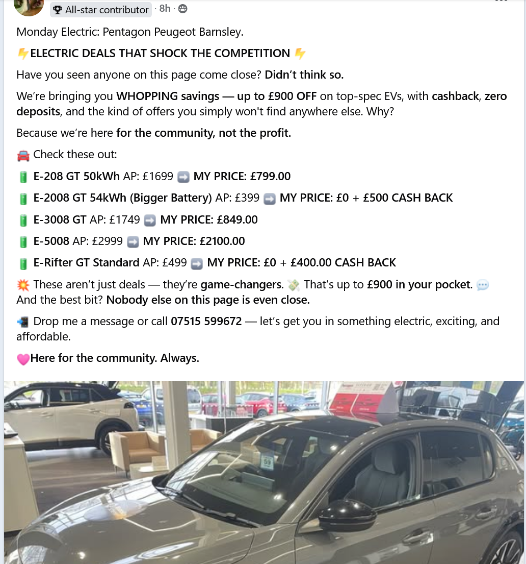 Via the usual fb groups posted today 14th April 25, and further to previous posts above, Pentagon Peugeot in Barnsley, South Yorkshire are now offering upto £900 (either discount/cashback or a combination of both) off Peugeot EV’s as listed below. Dealership contact is Tim.