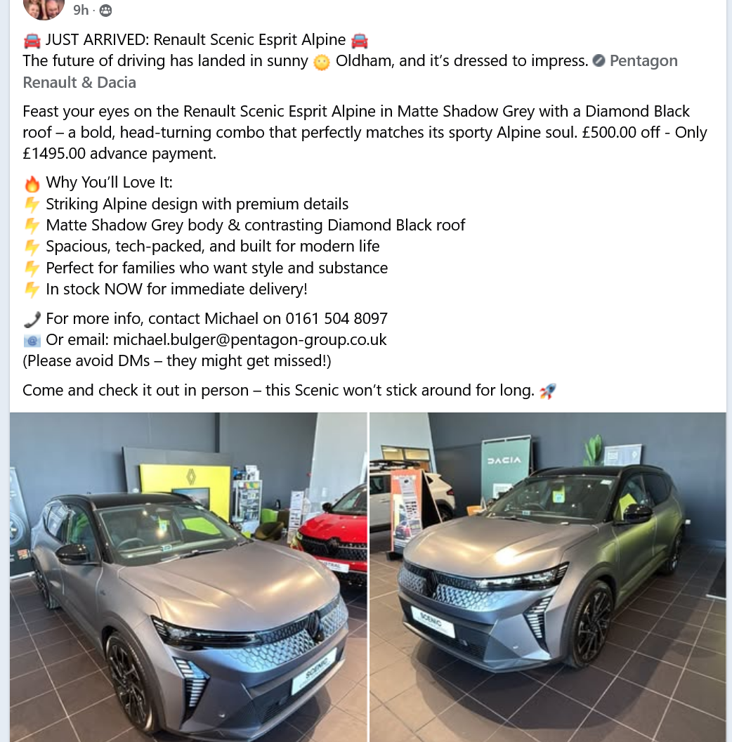 Via the usual fb groups, posted today 14th April 25, Pentagon Renault in Oldham, Gtr Manchester are offering £500 off the AP of one stock Renault Scenic Esprit Alpine in Grey with black roof: