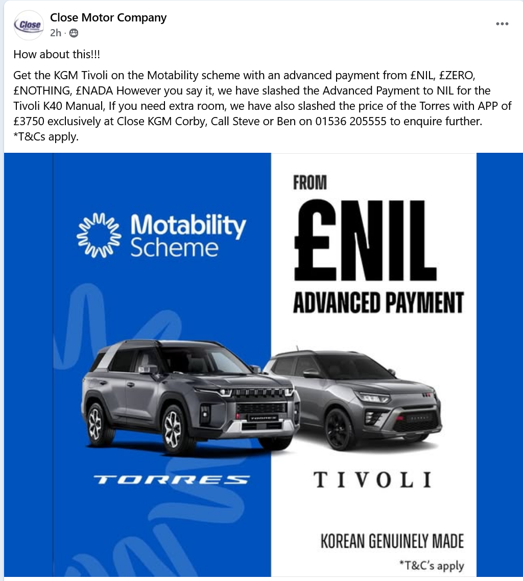 From the dealership’s fb page, posted today 14th April 25, Close Motor Company KGM in Corby, Northamptonshire are offering the KGM Tivoli K40 Manual for Nil AP (normally £299). Also the KGM Torres Auto on offer for £3750 (normally £3999):