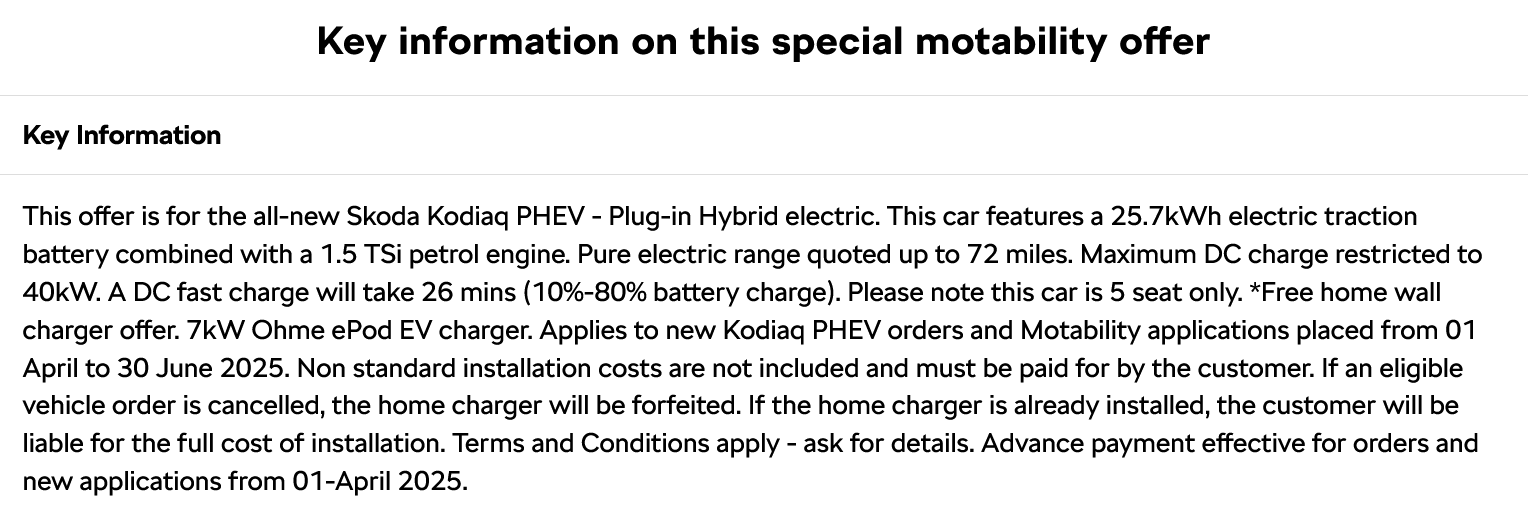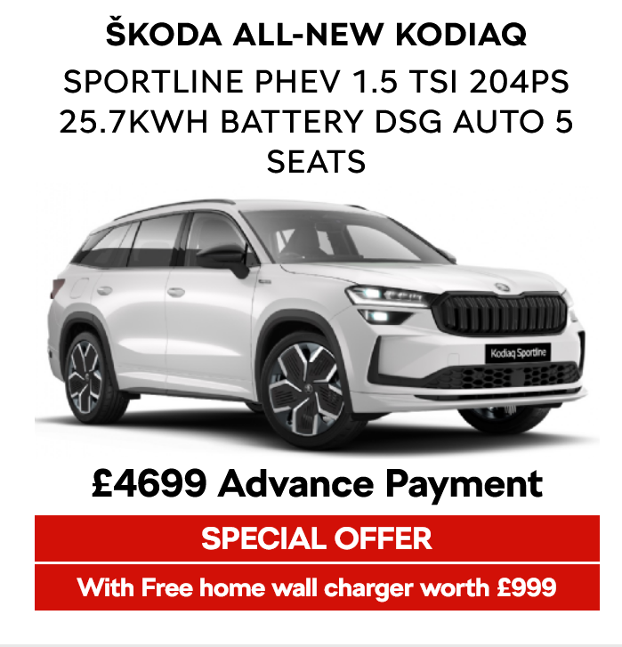 From the dealership website, Howard Abraham Skoda in Lurgan, Co Armagh, N.I. are offering a free home wall charger with standard installation on the 5 seater New Skoda Kodiaq 1.5TSI PHEV. For Motability orders placed by 30th June 2025 (Home wall chargers normally only being free of charge on battery EV’s not PHEVS).