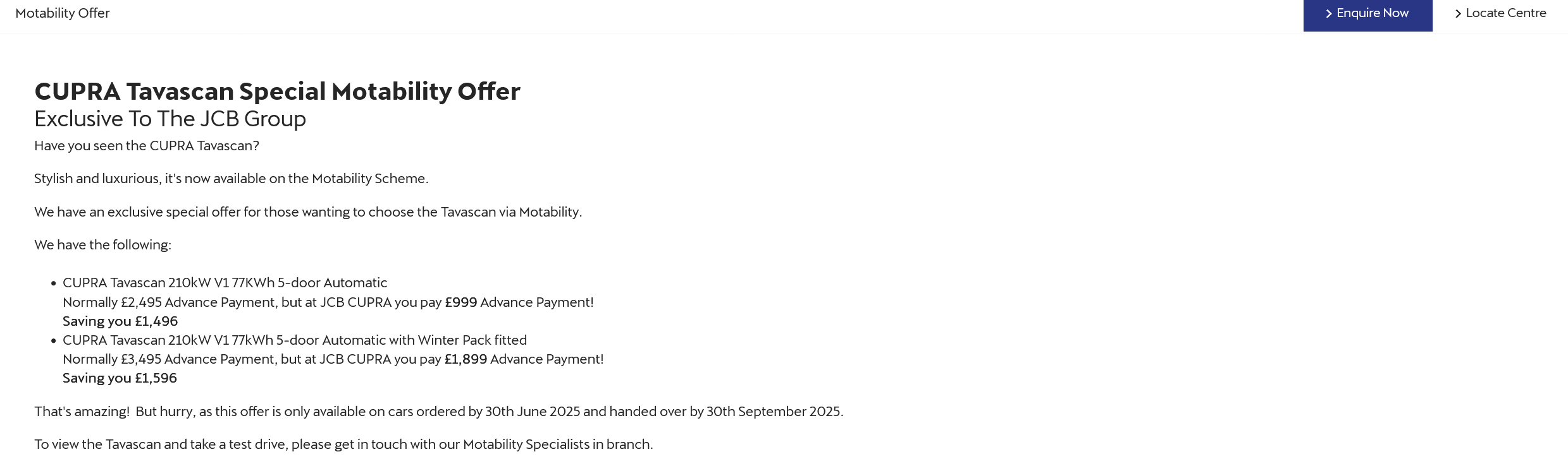Tavascan Motability Offer weblink: https://www.thejcbgroup.co.uk/cupra/motability-offers/special/cupra-tavascan-motability-special-offer