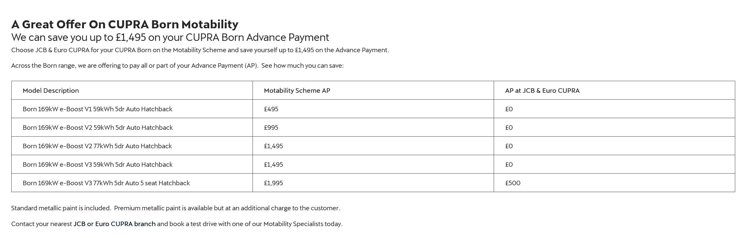 Born Motability Offer Weblink: https://www.thejcbgroup.co.uk/cupra/motability-offers/special/cupra-born-motability-offer