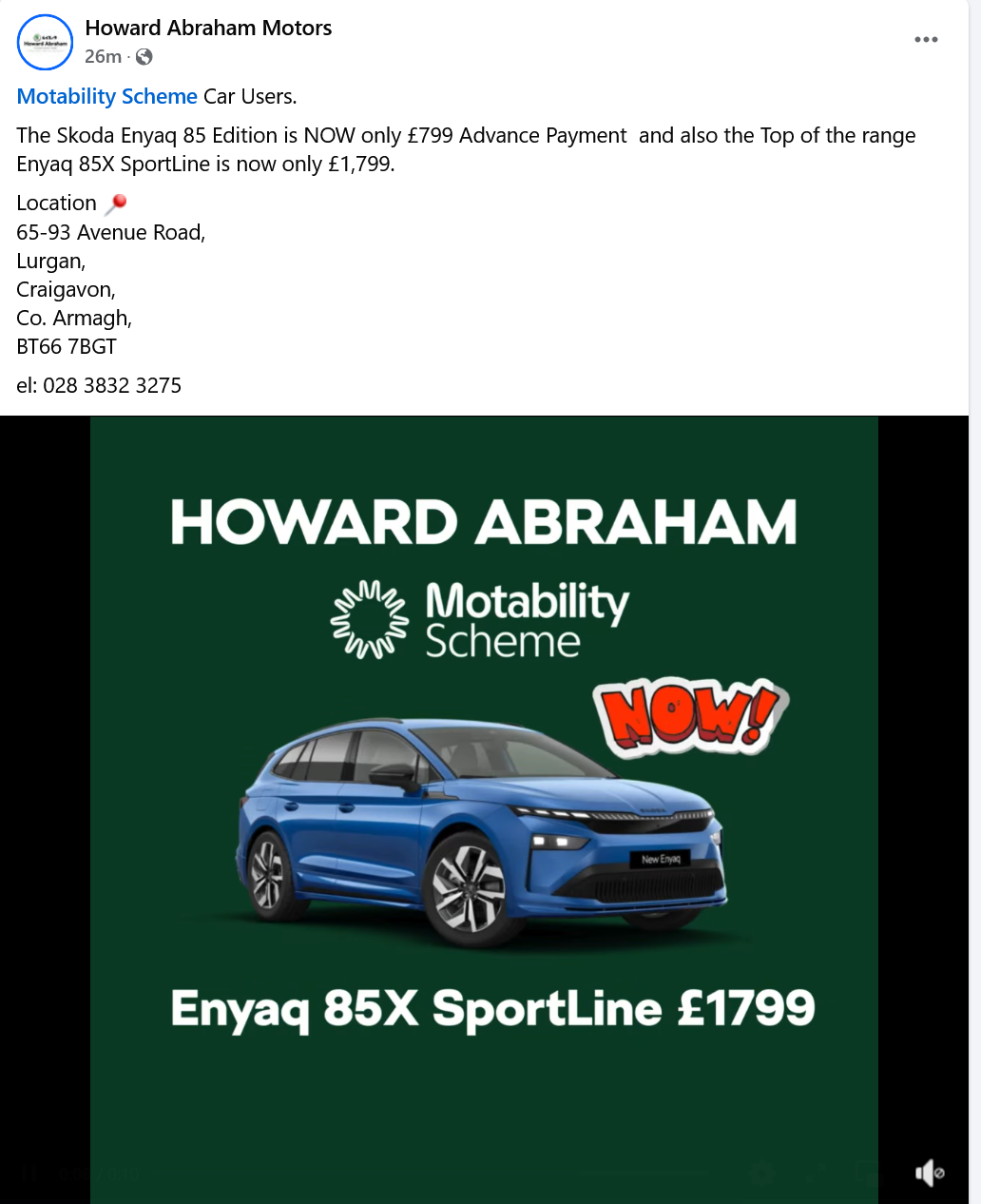 From the dealership’s fb page posted today 15th April 2025, Howard Abraham Skoda in Lurgan, Co Armagh, N.I. are offering a £500 dealership contribution off the Skoda Enyaq 85 Edition (currently £799 – normally £1299) and 85X Sportline (currently £1799 – normally £2299) as detailed below: