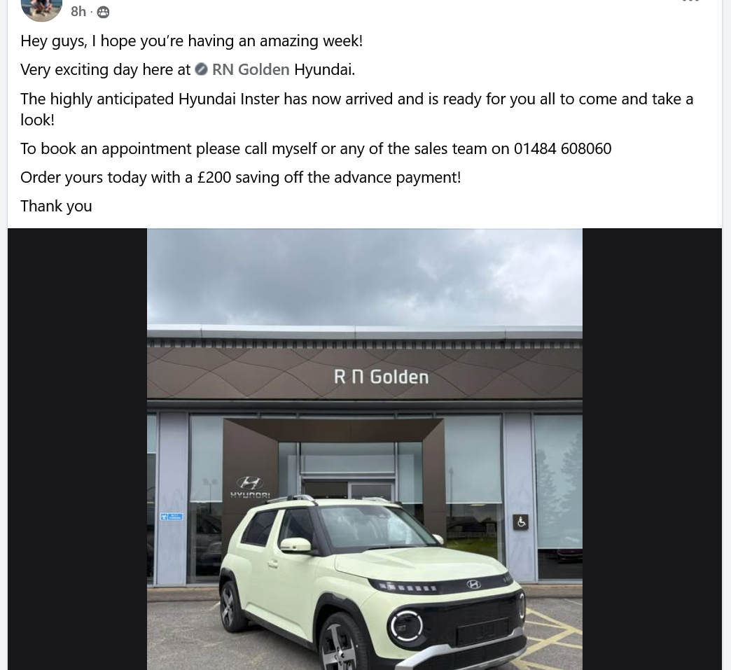 Via the usual fb groups posted yesterday, 15th April 25, RN Golden Hyundai in Huddersfield West Yorkshire e offering £200 off the AP of the Hyundai Inster: